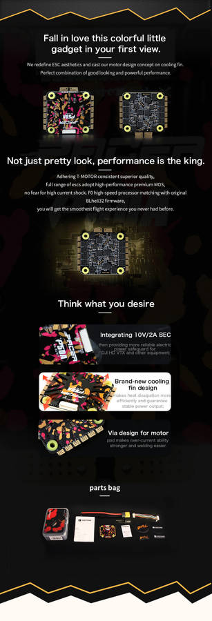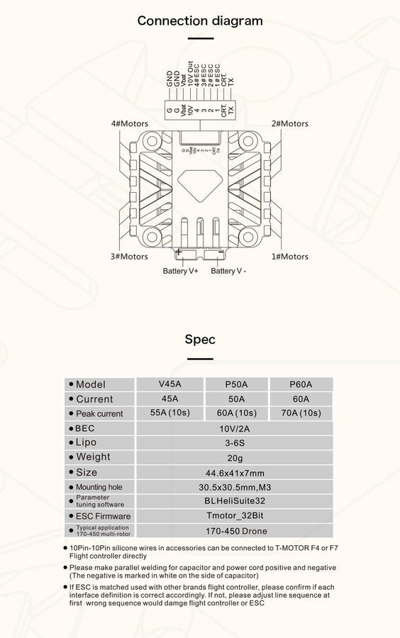 Specification: Brand Name: T-Motor Model: Pacer P60A Item Name: 60A 3-6S BLheli_32 4In1 Brushless ESC Con. Current: 60A Burst Current: 70A (10S) Input Voltage: 3-6S Lipo Firmware: Tmotor_32Bit Size: 44.6x41x7mm Mounting Hole: 30.5x30.5mm M3 Weight: 20g