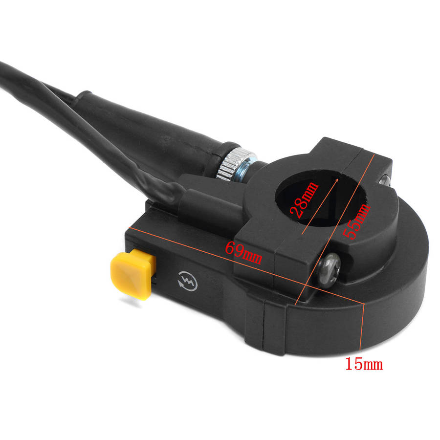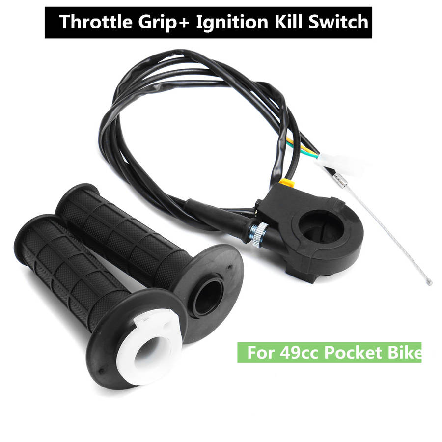 Description: Throttle Grips And Ignition Kill Assembly For Pocket Bikes, Mini Bikes, Chopper. Aftermarket universal throttle grips with cable and ignition kill switch. For twist throttle only. Will not work with thumb throttle. Easy to install and use.