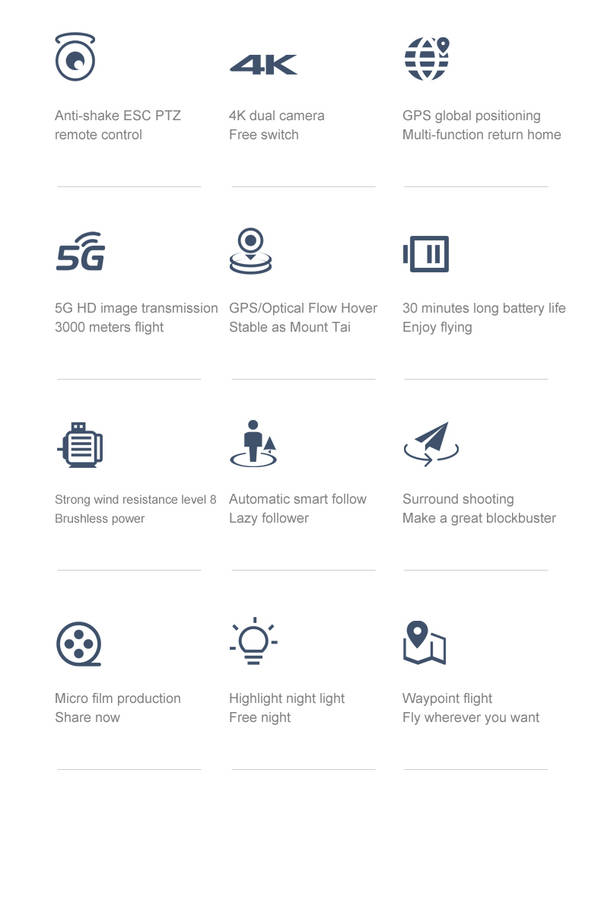 Function: Up/down, Forward/backward, Turn left/right, Sideward flight, 3-level flight speed, LED Light, GPS Positioning, Follow Me, Surrounding Flight, Waypoint Flight, Altitude Hold Mode, Headless Mode, One Key Return, One Key Takeoff /Landing, WiFi FPV, Camera/Video