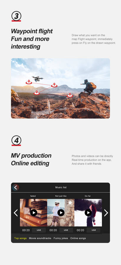 - Following: GPS intelligent follow; Image follow: Recognize gps signal to automatically follow the flight.