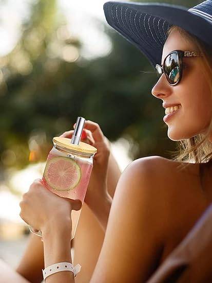 4Pcs Beer Drinking Glass Cup 500ML Can Shaped Glasses Beer Glass Cup with Bamboo Lids and Stainless Steel Straws High Temperature Resistance Beer Glass Tumbler for Soda Coffee Tea
