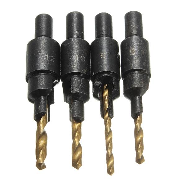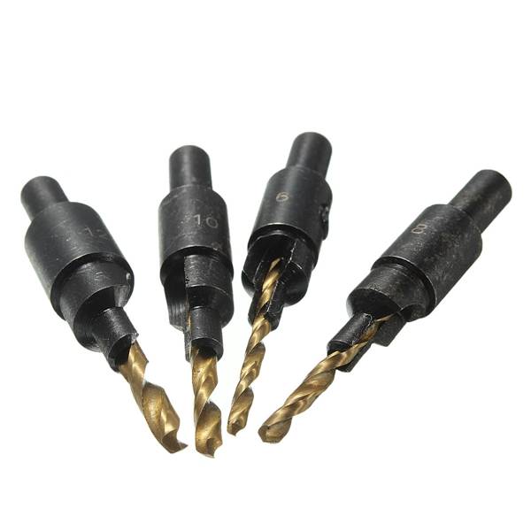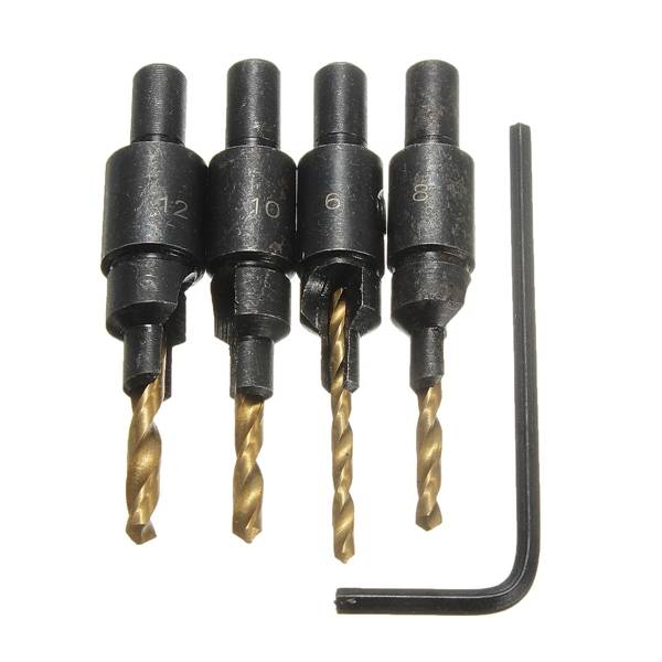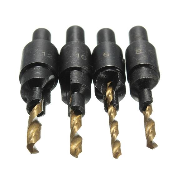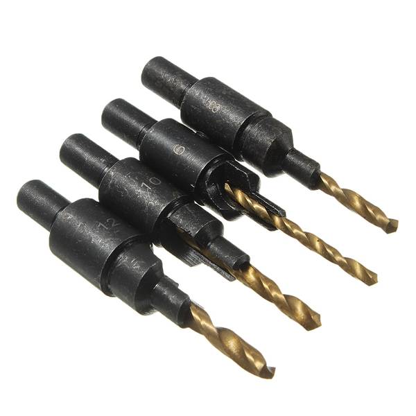 4pcs HSS Countersink Drill Bit Set Counter Bore Screw Woodworking ToolDescription:This 4pcs woodworking countersik drill bit set has excellent workmanship and durability with titanium-coated HSS.The drilling length can be adjusted for various length screws simply by loosening and tightening the setscrew with the adjustable counter sleeve depth design ideal for less than 25HRC hardness workpieces countersinking, such as carbon steel, sheet iron, insulation board, PVC board, wood, etc.