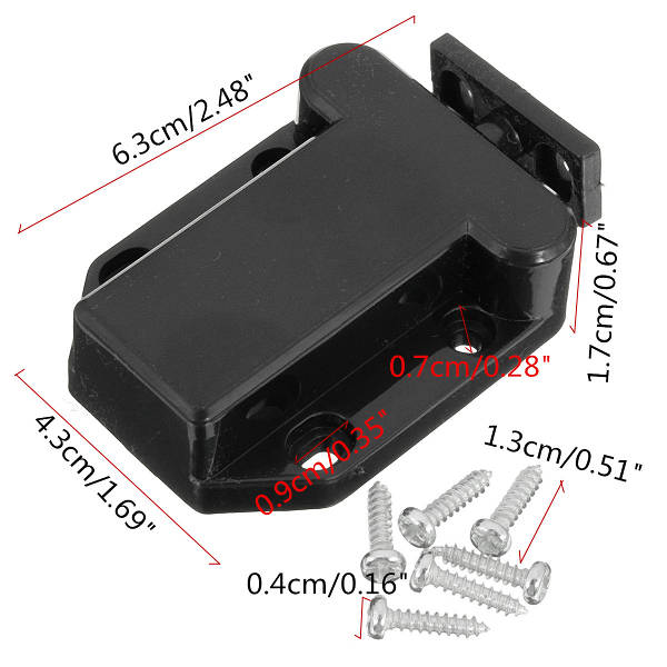 Package weight: 0.10 kg Description: Push Open Catch Touch Latch Release is suitable for installation in the absence of shake handshandle drawer or cabinet. Specification: Material:ABS Color:Black Size:(L)X(W)X(H) 6.3X4.3X1.7cm/2.48"X1.69"X0.67"(appr.) Features: 1.Suitable for installation in the absence of shake handshandle drawer or cabinet. 2.For use where magnets would be harmful, such as near computer tapes and disc storage. 3.Unique beetles shape, built-in clip spring contraction, push gently to open or close door. 4.Cannot be pulled open or pushed open from the inside by falling objects. 5.Counter piece consists of two parts allowing for easy adjustment even after the body is attached. 6.Simple to use and easy installation. Package included: 4 x Push Latch 24 x Screws