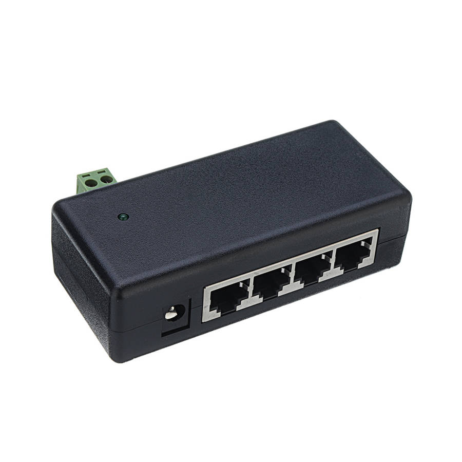 Features: ? a??? 4 LAN ports, 4 LAN and power ports a??? Power VOIP phones, IP cameras, WiFi access points, and so on a??? Same voltage to all ports, power is shared equally a??? 2.1 x 5.5 mm for DC plug a??? LED power light a??? Works with any Ethernet switch or router a??? Uses 48 V power adapter to output 48 V power supply a??? Plastic case a????10*4.7*3.1cm size Package included: