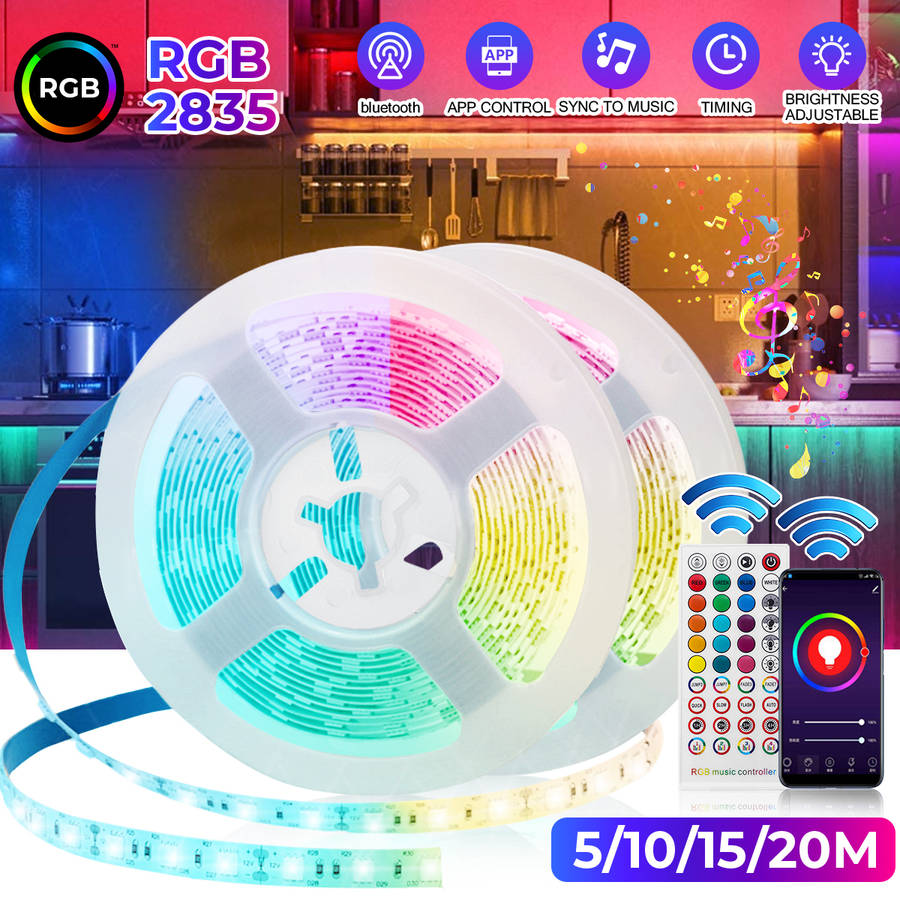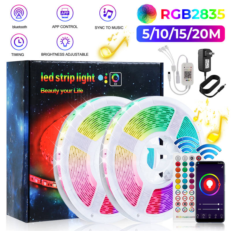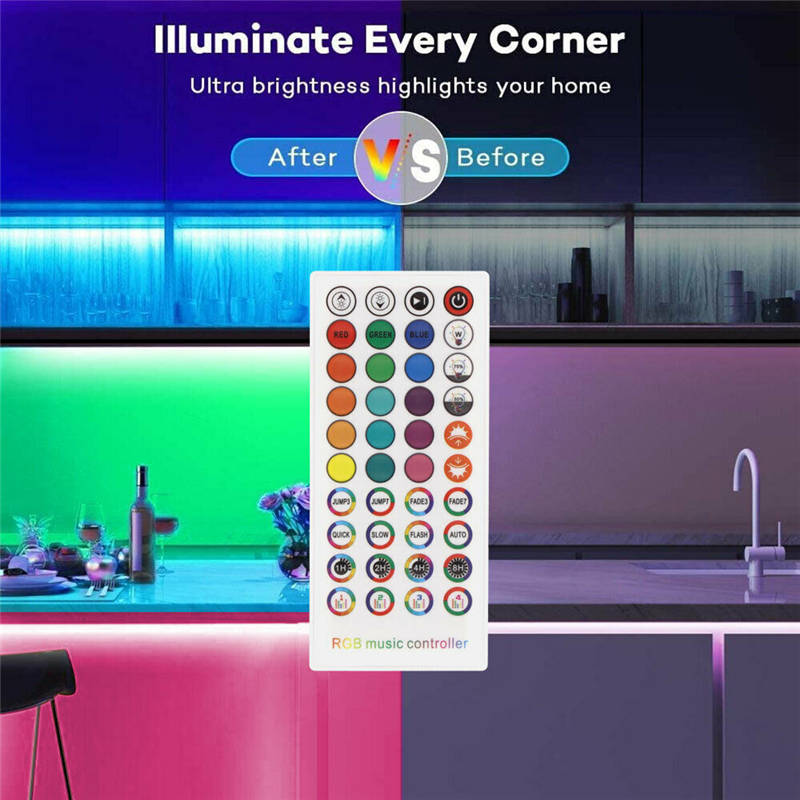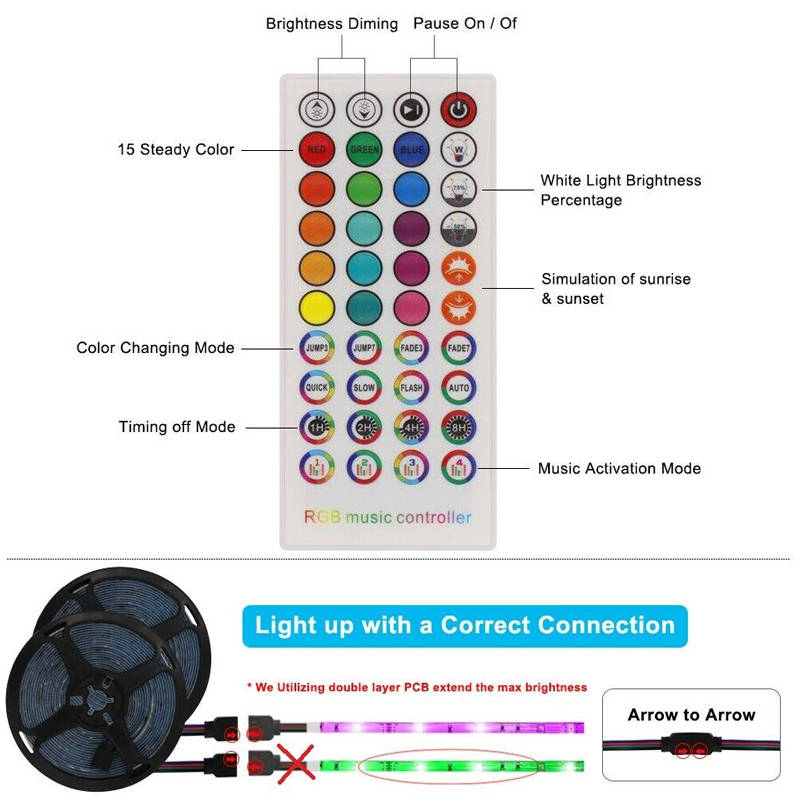 Better lighting effects: Brighter RGB 2835 LEDs and double-layer copper is used on the PCB board to make the RGB color mix more uniform and brighter. The led lights can also be controlled using 40key remote control, 16 colors, 4 flash modes, 19.6ft-26.2ft control distance