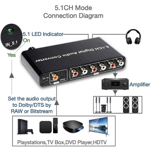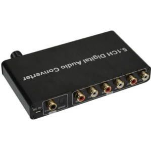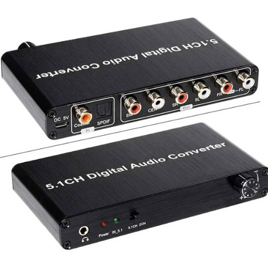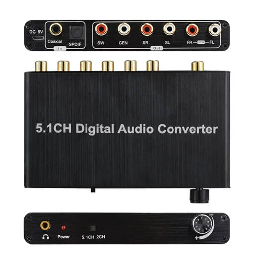 Digital SPDIF (Toslink / Optical) and Coaxial input ports, 6 RCA Cinch channels output (FL, FR, SL, SR, CC, SUB), and 3.5mm stereo headphone port; automatically recognize the input signal and automatically switch between optical and coaxial channel