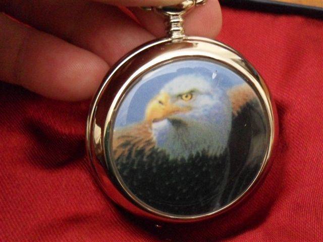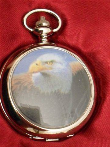 2.....EAGLE 1800'S STYLE REPLICA......PRACTICAL AND ELEGANT WATCH....CASING IS POLISHED STEEL HINGED WITH AN ENAMELLED PICTURE OF A BALD EAGLE...WHITE DIAL BATON STYLE HANDS AND NUMBERING ....BACK IS BURNISHED STEEL...