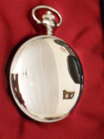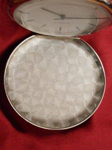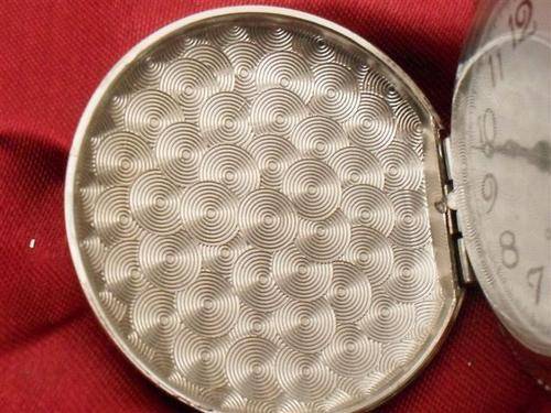 3....BAHAUS 1920'S STYLE....POLISHED STEEL WITHOUT COVER....BLACK DIAL DAUPHINE HANDS AND ROMAN NUMERAL NUMBERS....THE WINDER IS AT 3 O CLOCK RATHER THAN THE USUAL 12 O CLOCK....WIDE RIM AROUND DAL....BACK MACHINE TOOLING CONTRASTS WITH THE SMOOTH SURFACE....