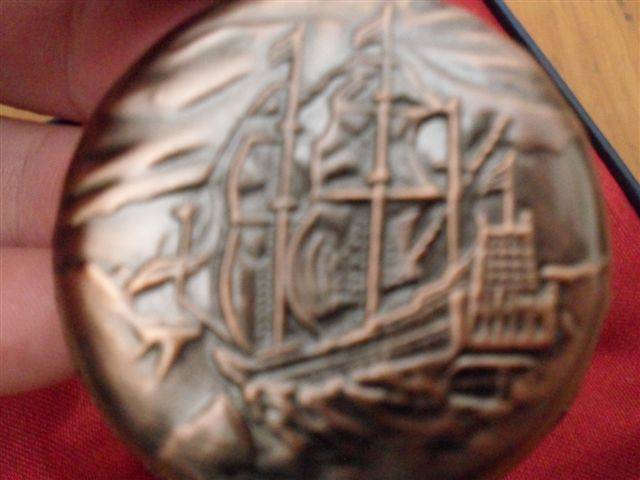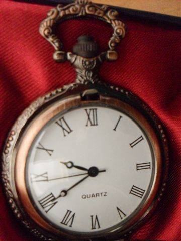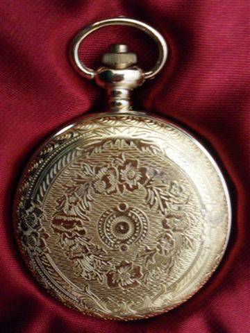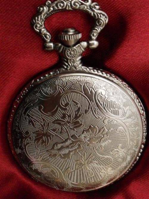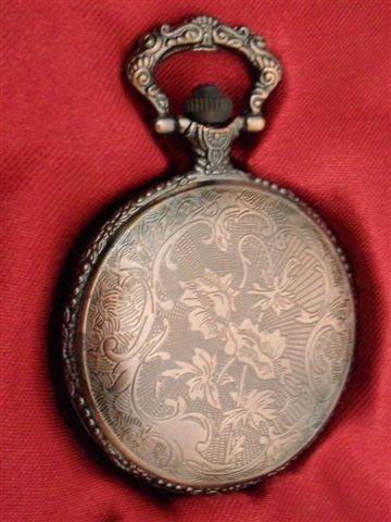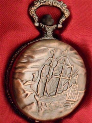 1....SEA CAPTAIN 1750'S STYLE REPLICA...CASING BRONZE COLOURED METAL.. COVER DECORATED WITH A GALLEON...RIM AND HANDLE ALSO DECORATED....DIAL HAS WHITE BACKGROUND WITH ROMAN NUMERALS AND BREGUET HANDS....NO CLUTTER OR DECORATION ON FACE AS READABILITY IS IMPORTANT AT SEA....BACK HAS GARLAND OF FLOWERS AND EXTRVAGANT SCROLL WORK....