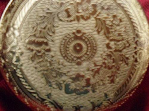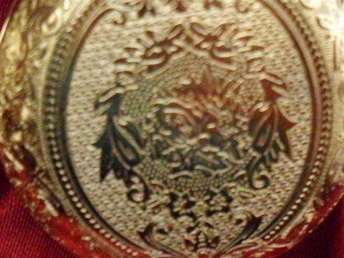 4....BAGATELLE 1860'S STYLE IN THE TASTE OF EMPRESS EUGENIE.....CASING FASHIONED YELLOW GOLD METAL WITH GUILOCHE DECORATION...RIPPLED EFFECT INSIDE COVER...WHITE DIAL ....ARABIC NUMBERS BATON/BREGUET HANDS.....FRONT ENGRAVED PROFUSION OF FLOWERS WITH OVAL WREATH...BACK OF CASING WREATH ROUND NOT OVAL.....