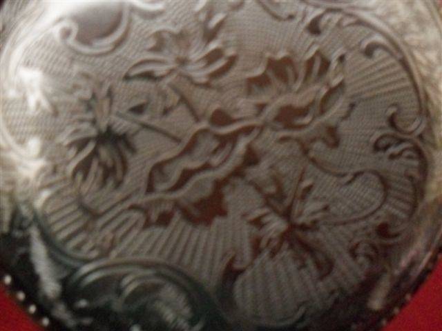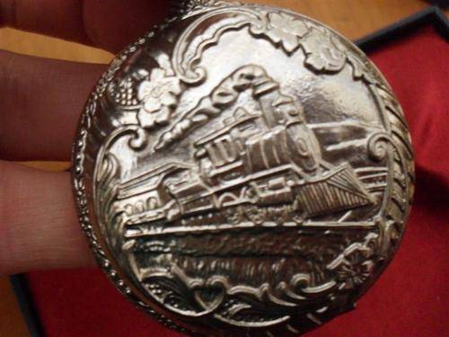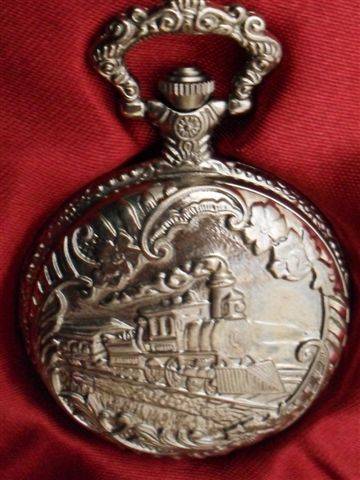 5...... RAILWAY 1870'S STYLE ...CASING SILVER COLOURED METAL WITH EMBOSSED STEAM LOCOMOTIVE....WHITE DIAL LARGE NUMERAL ARABIC FIGURES...EASY TO READ SECOND HAND....BACK ENGRAVED WITH EMBOSSED FLORAL MOTIF THAT IS THE SAME AS THOSE FRAMING THE LOCO.....
