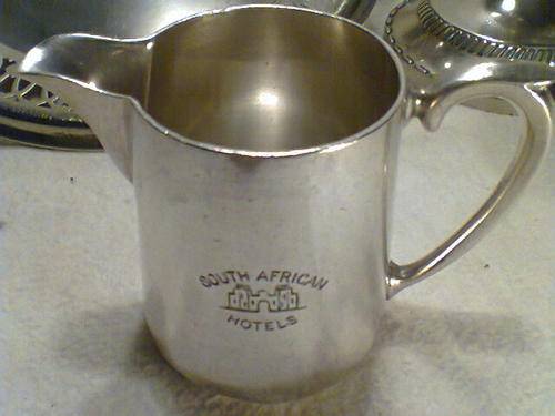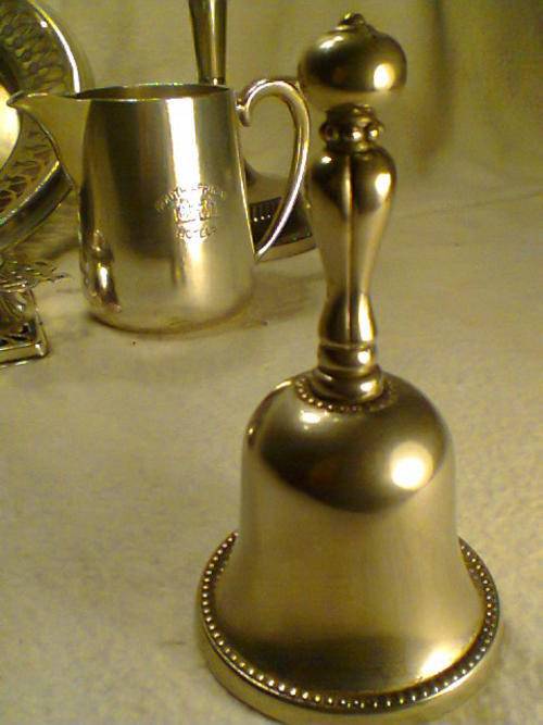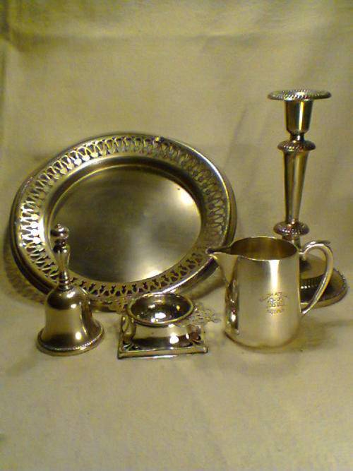 5 Beautiful Old Vintage EPNS Items. Candlestick,Tea Sieve,SA Hotels Milk Jug,Bell, Bread Board.