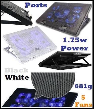 The notebook cooler offers a unique tilt with comfortable elevation angle settings. 5 Fan system Non slip pad design offers more security but caution recommend at all times. The cooler pad size 380 x 290 x 32 x 90mm speed 1000+10%RPM / 2000+10% RPM with air volume 74.35 CFM, DC Voltage of 5V notebook cooler weight around 680 grams