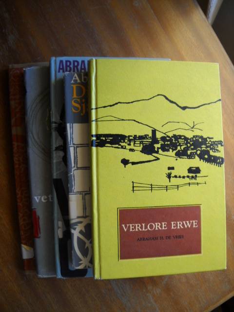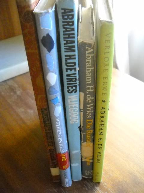 5 Hardebandboeke, binding is stewig. 4 van die boeke is ex-biblioteekboeke met plakkers, sakkies en stempels. Vetkers en neonlig met 95 bladsy. Ex-biblioteekboek en het aantekeninge in rooi pen by die inhoudsopgawe. Bliksoldate bloei nie, eerste uitgawe 1975 met 80 bladsye. Hoewel ex-biblioteekboek, is dit in mooi toeatand. Vliegoog, 1971 uitgawe met 102 bladsye. Ex-biblioteekboek, buiteblaaie toon geringe verwering en het kleeflintmerke. Die Rustelose Sjalom, eerste uitgawe 1965 met stofomslag, ex-biblioteekboek en 144 bladsye. Kleeflintmerke sigbaar op buiteblaaie. Verlore erwe, 1960 uitgawe met 95 bladsye, is nie 'n ex-biblioteekboek nie en in baie mooi toestand. Posgeld in RSA = R58.00
