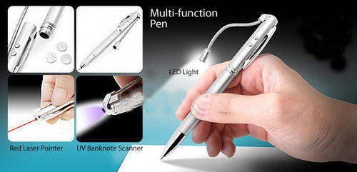 This laser and stylus Pen comes with a LED light, UV light and Laser. Introducing the Laser pen which is a Simple, stylish and a great quality 5 in 1 pen. Now look a little closer, two lights on the back end of the pen. One a laser, with pin point accuracy – the perfect pointing system especially for presentations, Two a UV light – the perfect bankers light to see bad notes but when you look even closer what looks like a clip is infact, another LED light that is supported by a bendable steel clip to see the script during those badly lit presentations, or just to use in the dark. The tip of the pen is a normal pen but if jou turn the nib of the pen again it retracts and a stylus pen emerges, FANTASTIC!!