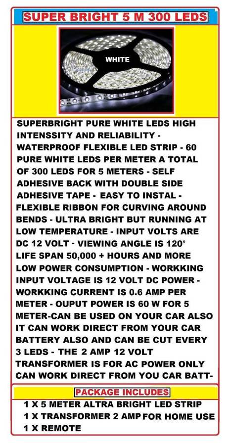 5 METER ROL LEDS WHITE WATERPROOF + POWER SUPPLY + REMOTE