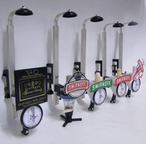 These optics look in fine working condition, 1 is missing the rubber seal where the liquor bottle would attach to the optic (see last pic), I am sure this can be replaced. 4 are made in England, 1 with no markings. They are about 34cm tall.
