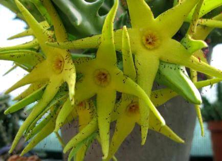 With its diversity in shape, colour, size and smell the Stapeliads are one of the most interesting groups of succulents to collect and grow. The genus Orbea has beautiful flowers and is one of the easier groups to grow successfully. Even sterile plants with their purple-blotchy stems against various shades of green backgrounds are very attractive. In a rockery, mats of the plants among exposed rocks give a good backdrop for other accent plants such as euphorbias and larger aloes. Orbea lutea ssp. lutea grows up to 100 mm high and, although usually erect, tends to sprawl when growing in shade. The stems are angled and also have prominent teeth. The flowers are produced in clusters of a few up to 17 and are carried at the base of the branches. The bright mustard-yellow to yellow corolla lobes have marginal vibratile hairs that dangle and move in the slightest breeze. The name is derived from the Latin word luteus which means yellow. Open flowers have a strong foul-smelling odour that attracts large numbers of fly pollinators. Flowering is mainly between December and February. This is the most widespread species of Orbea in South Africa found in all the northern provinces, Free State, KwaZulu-Natal and the Northern Cape. You're buying a pack of 5 Seeds We'll supply you with all the germination & care instructions. |