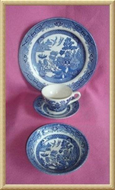 A LOVELY 5 piece CHURCHILL BLUE & WHITE WILLOW PATTERN PORCELAIN SET, CONSISTING OF 1 X PLATE ( 26cm diameter ). 1 X BOWL ( 15.5cm diameter ), 1 X CAKE PLATE ( 17cm diameter ), 1 X CUP ( 6.5cm height, 9cm diameter ) & 1 X SAUCER ( 14cm diameter ), ALL IN GOOD CONDITION, NO CHIPS.