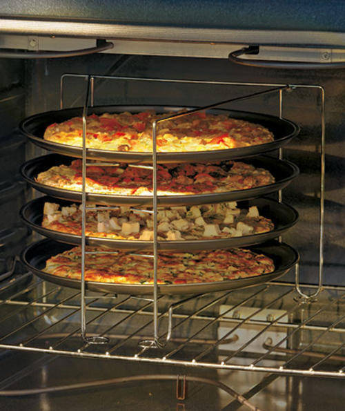 Cook up to four 12" pizzas at the same time. The steel rack sits on top of your oven's existing wire rack and holds 4 nonstick pizza pans. Each 12-7/8" dia. steel pan is ventilated to evenly cook the pizzas. Oven safe to 475°F. The rack folds for easy storage, and the pans are stackable to save space in your cupboard. Rack, 13" x 12-3/8" x 10-1/4". Great for parties, sleepovers and family suppers; even works in smaller ovens. Oversize - Add R100.00 to shipping costs.