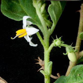 Solanum is a large and diverse genus of flowering plants, which include two food crops of the highest economic importance, the potato and the tomato. It also contains the nightshades and horsenettles, as well as numerous plants cultivated for their ornamental flowers and fruit. Solanum species show a wide range of growing habits, such as annual and perennials, vines, subshrubs, shrubs, and small trees. Many formerly independent genera like Lycopersicon (the tomatoes) and Cyphomandra are now included in Solanum as subgenera or sections. Thus, the genus today contains roughly 1,500-2,000 species. Solanum catombelense, synonymously known as Solanum albotomentosum, Solanum rautanenii or Solanum sparsiflorum and commonly known as Bitter Apple is a South African indigenous species found in the Free State, Gauteng, KwaZulu-Natal, Limpopo, Mpumalanga, Northern Cape and North West Provinces. It is an erect to spreading perennial herb or small shrub to 1.2m that bears white flowers which are followed by edible fruit.