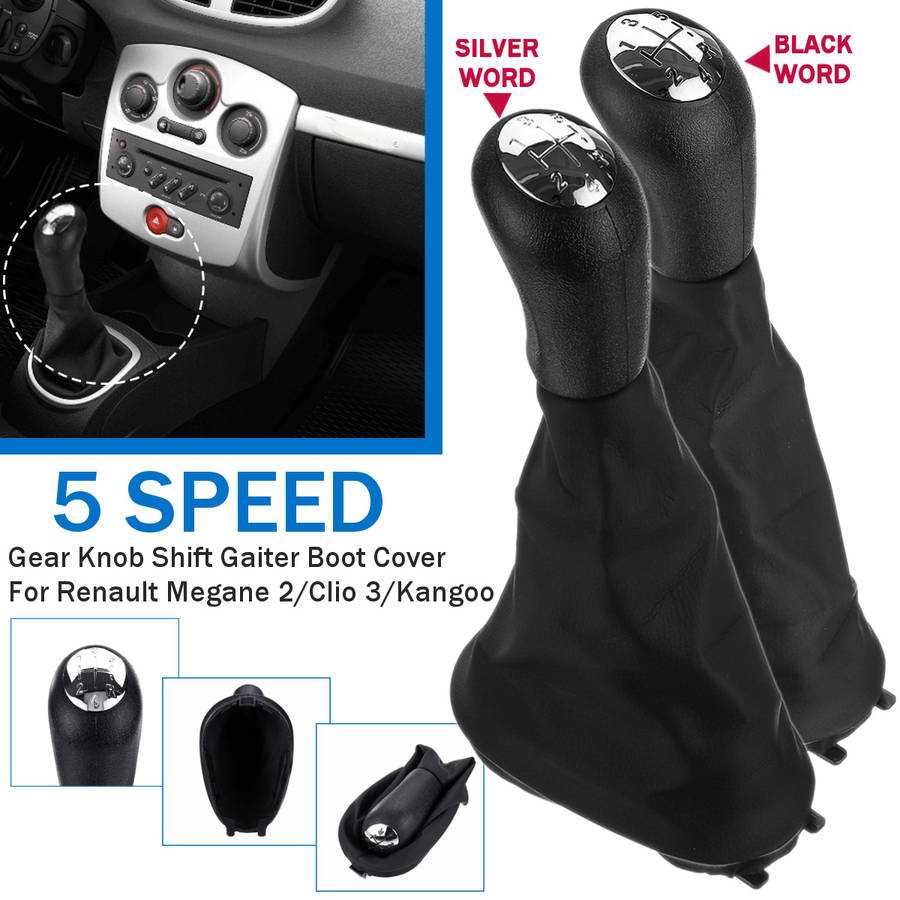 5 Speed Gear Knob Shift Gaiter Boot Cover For Renault Megane 2 /Clio 3 /Kangoo Description: Name: Gear Shift Knob and Gaiter Boot Cover Type: 5 speed Cap Cover: Glossy Silver Word Color: Black / Silver Material: PU Leather and ABS plastics Features: 1.With 5 speed scheme on top, no fading. 2.Made of PU Leather and ABS. Make your car elegant and fashionable. 3.Durable and comfortable to use. 4.Dust Proof. Make your car clean and tidy. 5.Easy installation. Just pull out the old knob, keep the white plastic sleeve on the gear shaft, then push the new one in. Compatible with: For Renault Clio II 2001-2004 For Renault Clio III 2005-2009 For Renault Megane II 2002-2009 For Renault Scenic II 2003-2006 For Renault Kangoo 2009 Note: 1.We provide clear pictures, measurements where possible. Please check as much as possible to make sure the item is the one that you need. 2.The color of the actual items may slightly different from the listing images due to different computer screen, thanks for your understanding. Package included: 1x Gear shift knob with boot cover
