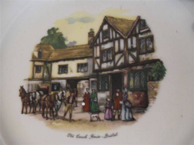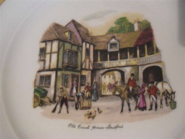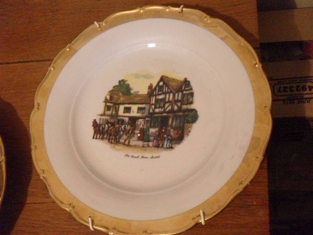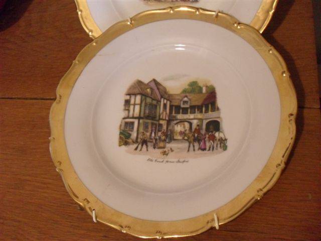 2 X PRETTY OLD COACH HOUSES WALL PLATES (GOLD RIMS)....MADE IN CZECHOSLOVAKIA ..OLD COACH HOUSE STRATFORD AND OLD COACH HOUSE BRISTOL....