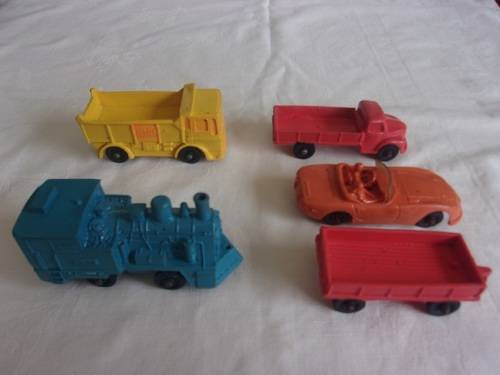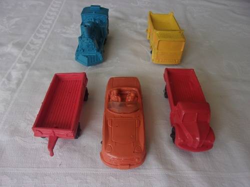 5 Vintage Tomte Laerdal vinyl/ plastic toy cars/wagon/train for 1 bid. I would date these collectable Norwegian made vinyl toys to the 1960s. The lot consists of: