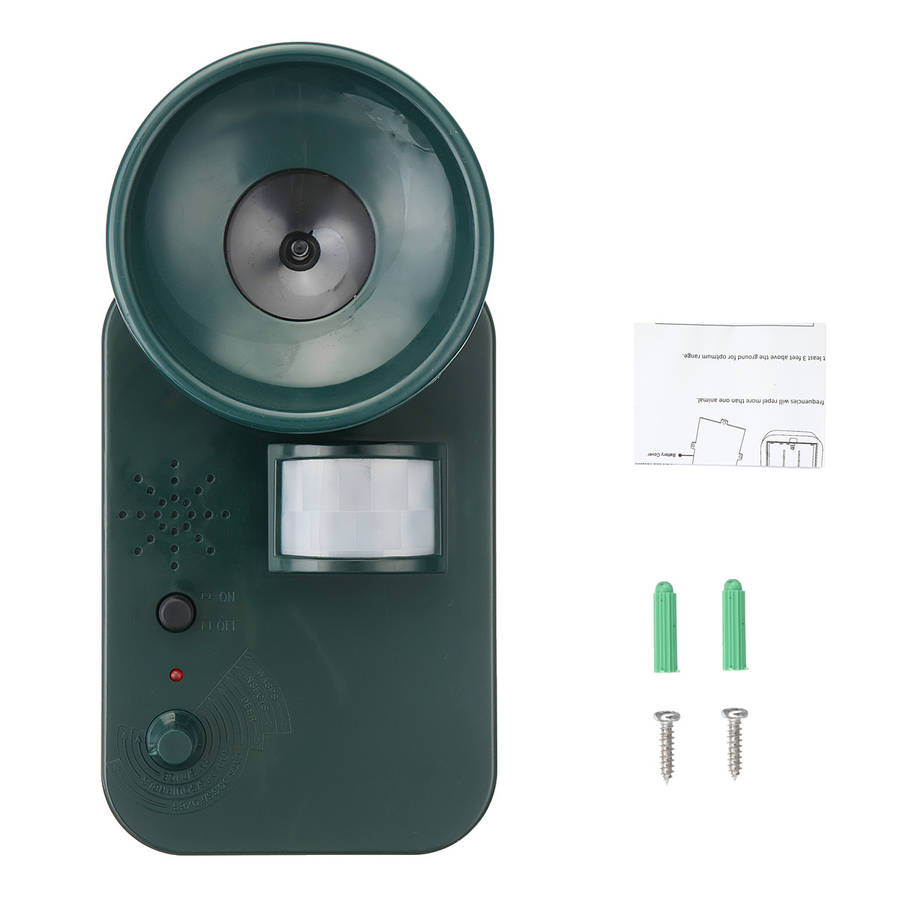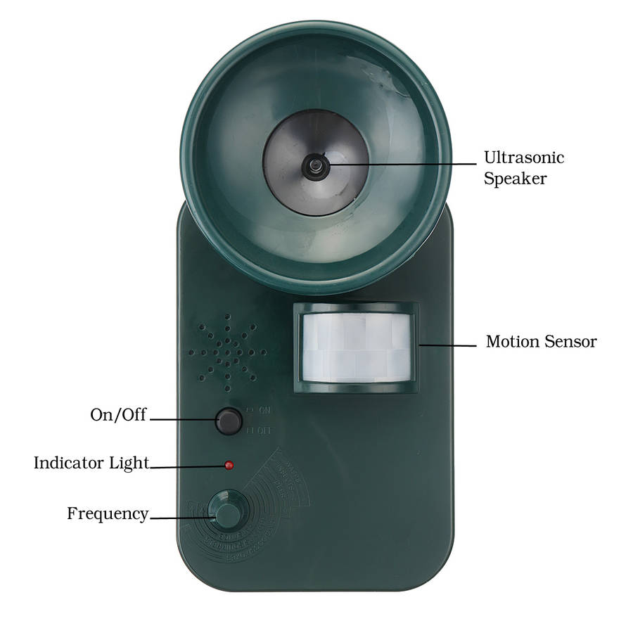 Features: 1. This repeller adopts swept frequency high frequency ultrasonic circuit to generate sweeping ultrasonic wave, can effectively repel disgusting animals. 2. This machine can lustrate house mouse, bird, dog, deer, bat, rodent, ect. 3. Motion sensor, it will emit a frequency and flashing light when movement is detected. The adjustable frequency allows you to select the pests that you want to repel, providing 24-hour protection. 4. Waterproof repeller. Suitable for outdoors using. 5. Safe, non-toxic, tasteless. Ultrasonic is harmless to humans. 6. Easy to install, powerd by replaceable battery.(Not included).