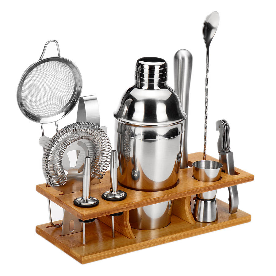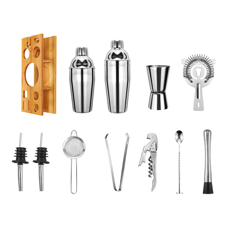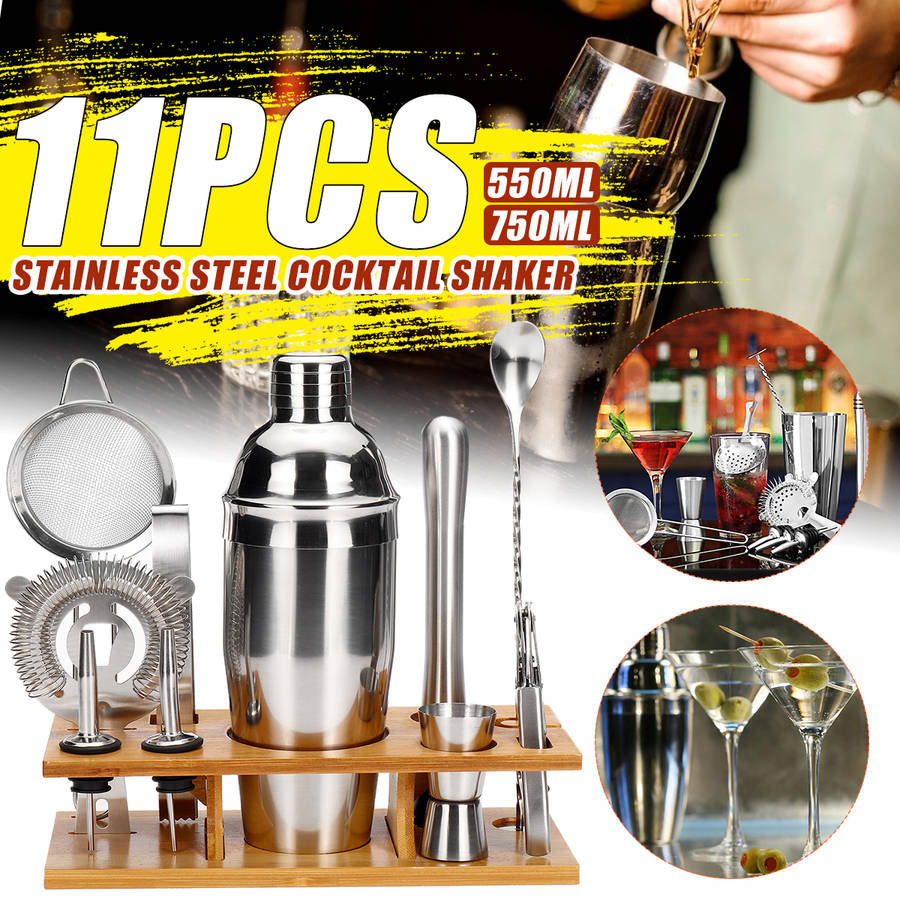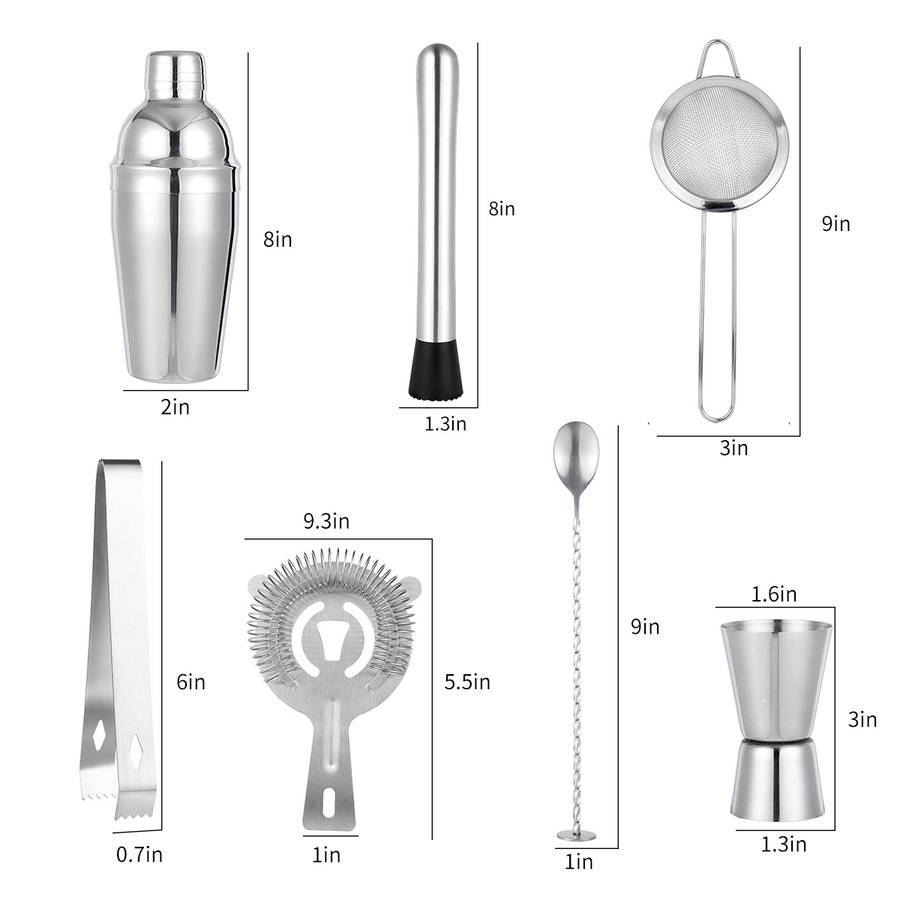 1 Prepare your cocktail recipe. 2 Pour all the ingredients into the mixing section of the cocktail shaker, using the jigger. 3 Add ice to the mixing section. 4 Put the lid with the built-in strainer on top of the mixing section. 5 Tap the top of the shaker with the palm of your hand to seal it tight.( Make sure its sealed well) 6 Hold the shaker in both hands, with one hand on top and one supporting the base. (Shake well for 10 to 20 seconds) 7 Remove the small lid and pour the drink through the strainer into a chilled cocktail glass and enjoy your cocktail! Package included: 11Pcs/set Shaker Details Pictures: