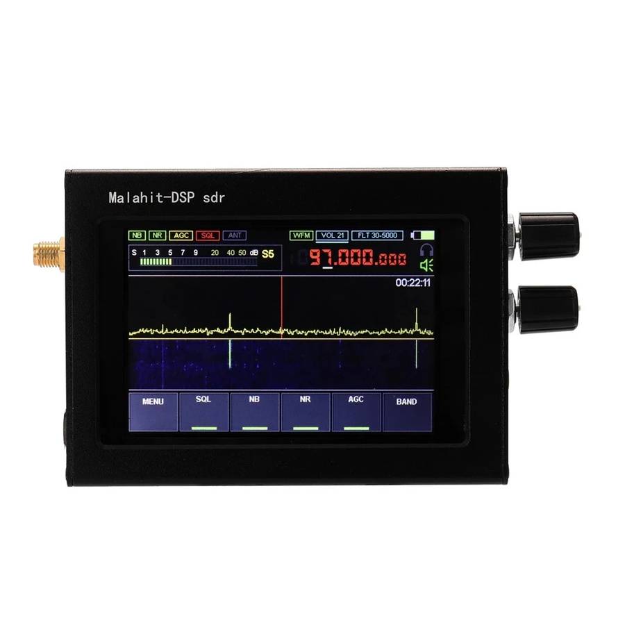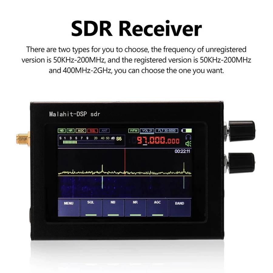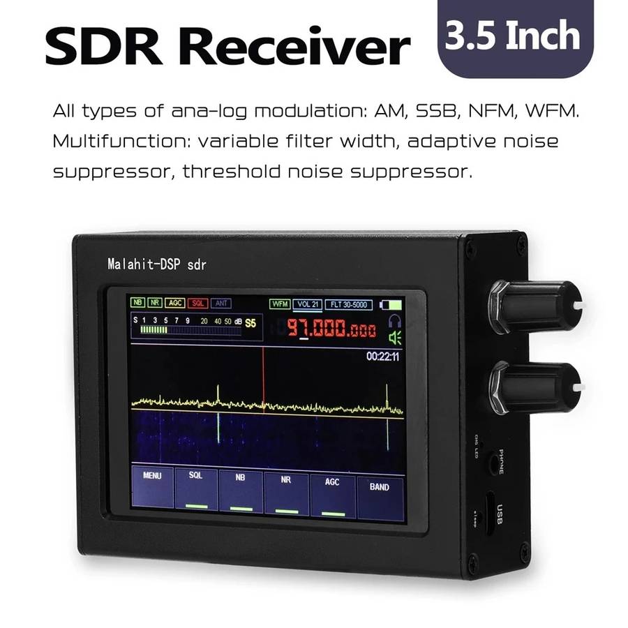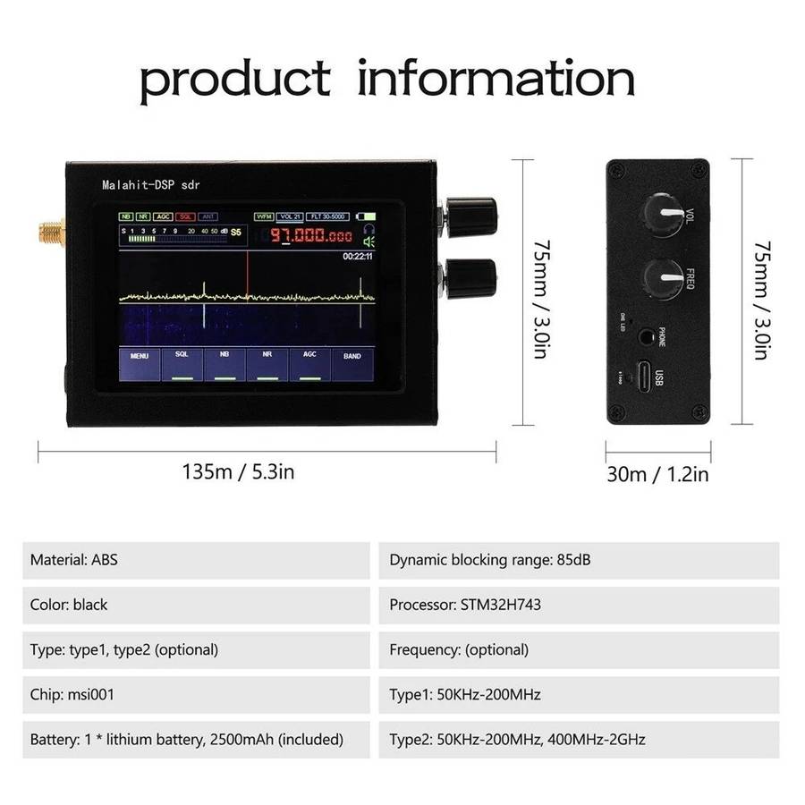 1)?The radio is constructed based on SDR principle, and its functions are determined by loaded software. 2) The frequency range is 50KHz-200 MHz?or 400MHz-2GHz?. 3) All types of analog modulation: AM, SSB, NFM, WFM; 4) Powerful functions: variable filter width, adaptive noise suppressor, threshold noise suppressor, Noise Blanker, AGC, equalizer. 5) Fully functional chip msi001 is used; 6) The clock frequency of stm32h743 is 480MHz. 7) With touch screen: 3.5 IPS display. 8) There is a built-in UHF. 9) Control: 2 encoders with buttons and a touch screen 10) It is powered by an external TYPE-C (for Huawei mobile phone) interface and can be charged by TYPE-C. The internal battery voltage is 3.7V and the capacity is 2500mAh. 11) Current consumption when listening to headphones is 300mA. 12) Built-in receiving module improves the HF reception on antenna, an additional board with a source follower has been developed. The board will be built into the standard receiver design. 13) Connecting to a computer via USB, it can transmit CAT, IQ and audio. 14) 160kHz span, with scalability. 15) Sensitivity is 0.3??V = 10dB at s/w under the condition of up to 250MHz. 16) Due to the characteristics of the msi001 chip used, dynamic blocking range is about 85dB. 17) There is backlight control. 18) SMA female antenna socket; 19) Dimensions 102X74X29mm (excluding the sizes of protrusions). 20) Weight 240g.
