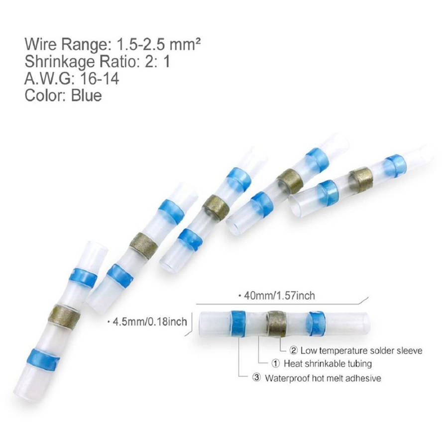 Size: 20X Red Shrink Connectors: diameter 3.0 mm, cable cross-section 0.5-1.0 mm² 15X Blue Shrink Connectors: diameter 5.0 mm, cable cross-section 1.0-2.5 mm² 10X White Shrink Connectors: diameter 1.5 mm, cable cross-section 0.3-0.5 mm² 5X Yellow Shrink Connectors: diameter 6.0 mm, cable cross-section 4.0-6.0 mm²