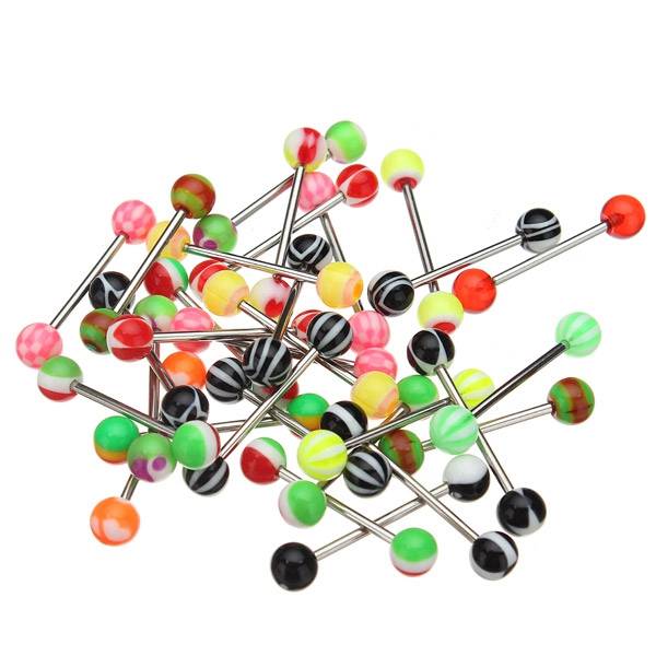 Description: Type: Tongue Rings Material: 316L Surgical Steel(Bar), Acrylic(Ball) Color: Mixed color, will be sent by random Gender: Women Ball Diameter: App 6mm Bar Size: App 18 x 1.6mm Quantity: 50pcs per pack Weight: App 30g