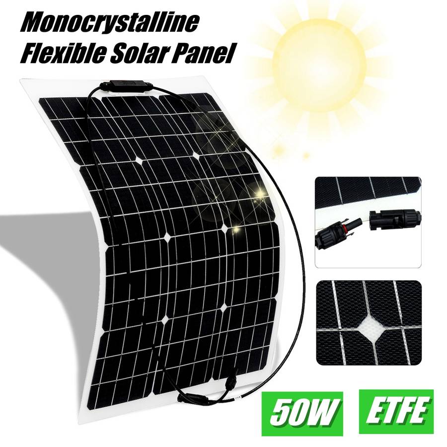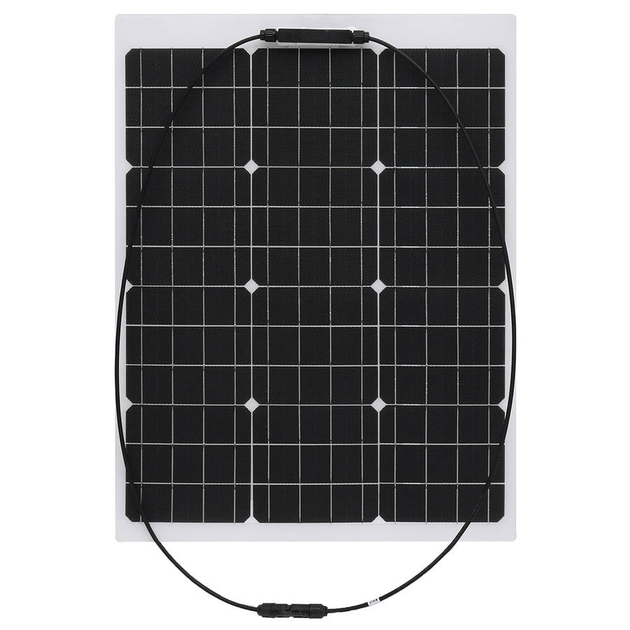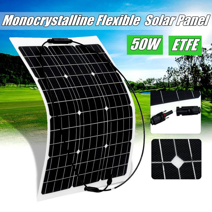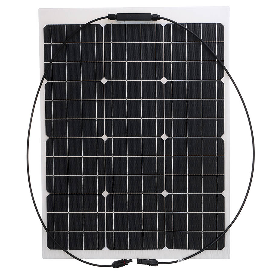 50W Monocrystalline Flexible ETFE Solar Panel. Semi-flexible, bendable, fold forward and backward. Light weight, easy to carry. Suitable for car batteries, car, RV, boat, ship, aircraft, satellites, space stations, outdoor breeding, planting, tourism, solar street lamp. Specification: