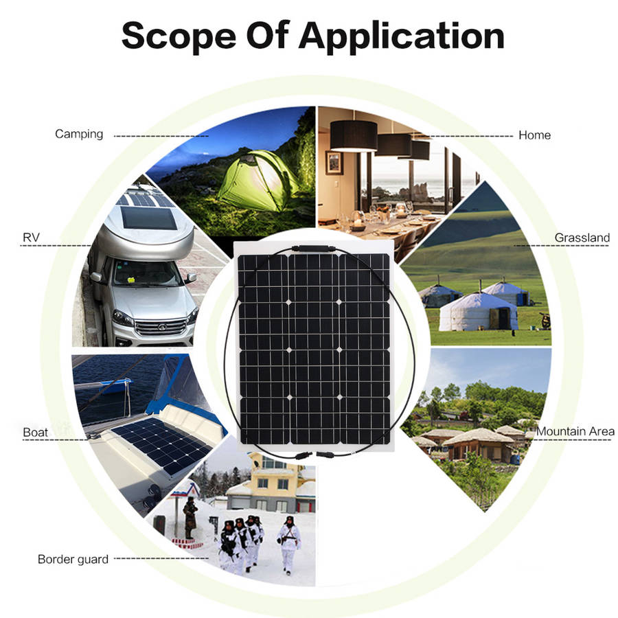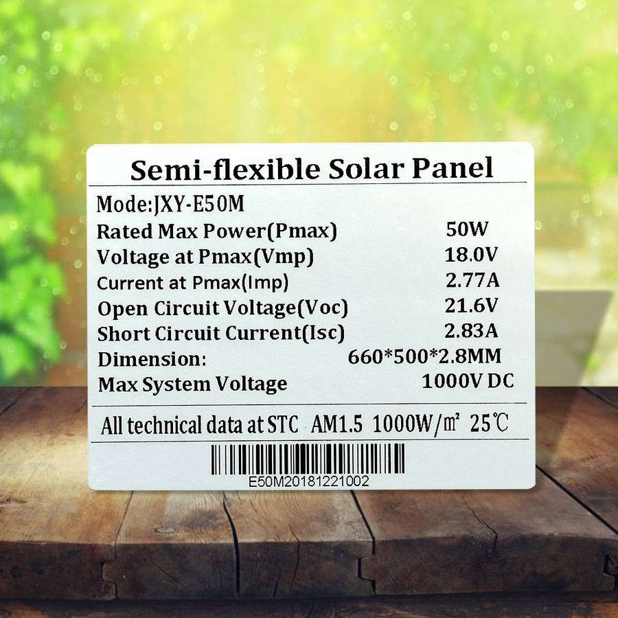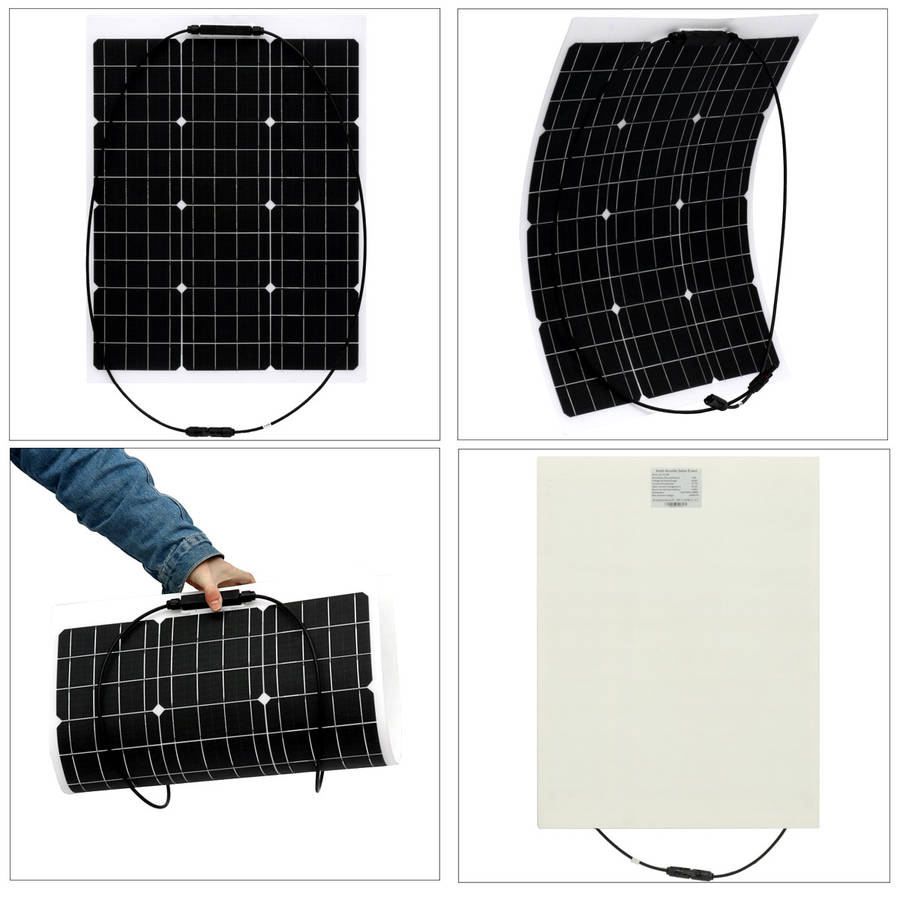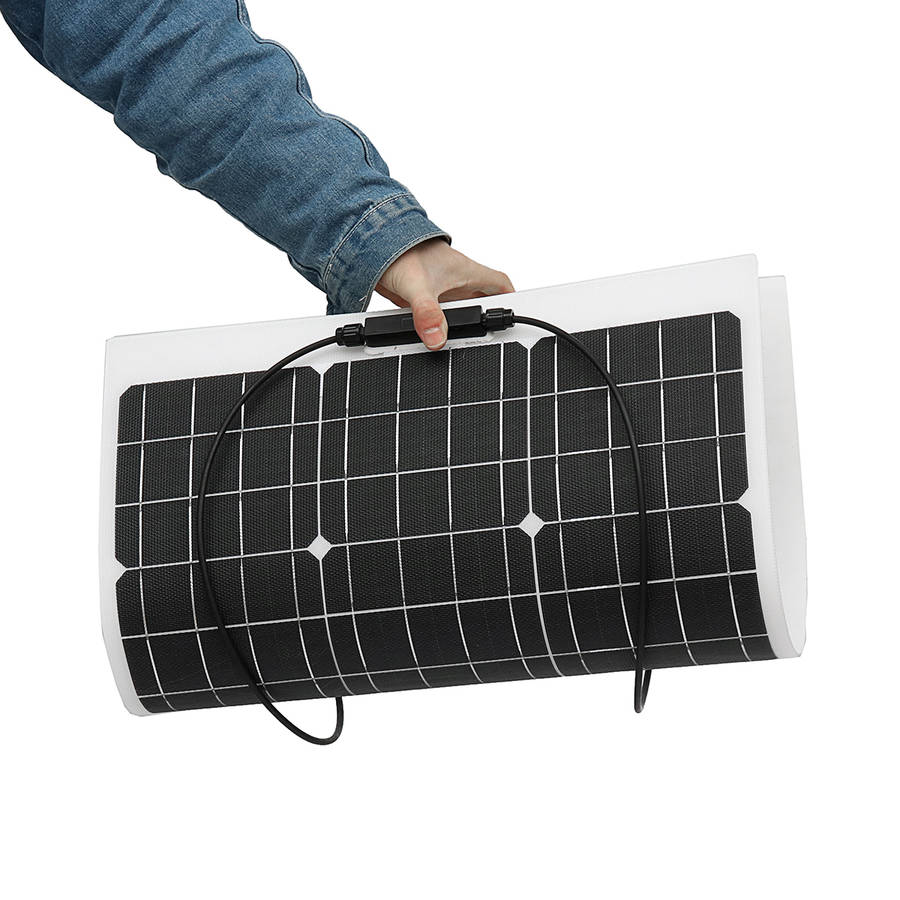 50W Monocrystalline Flexible ETFE Solar Panel. Semi-flexible, bendable, fold forward and backward. Light weight, easy to carry. Suitable for car batteries, car, RV, boat, ship, aircraft, satellites, space stations, outdoor breeding, planting, tourism, solar street lamp. Specification: