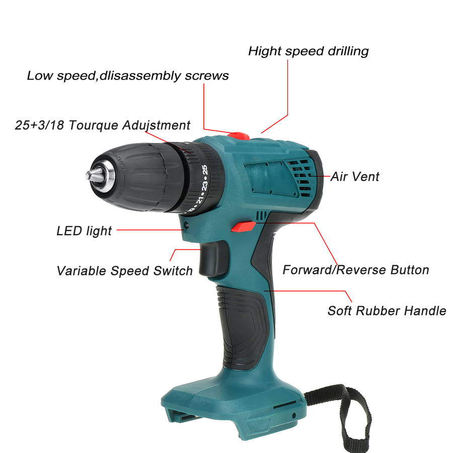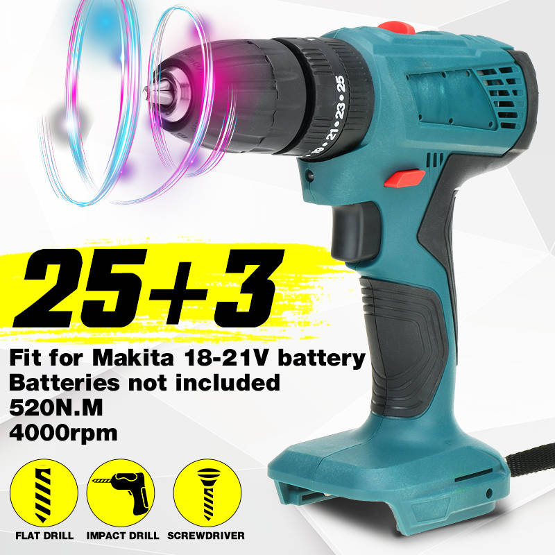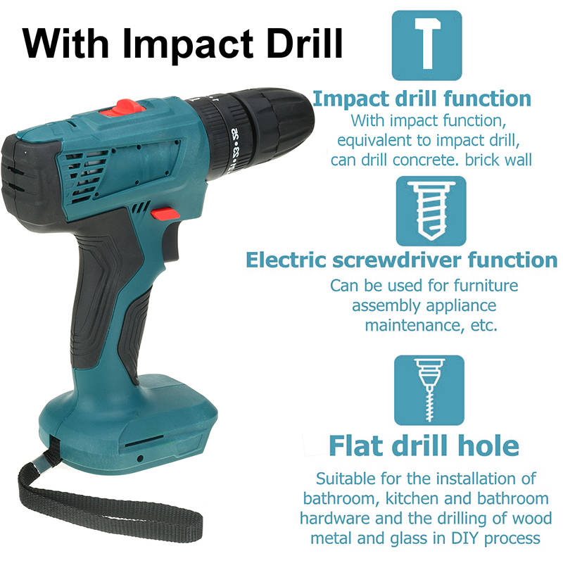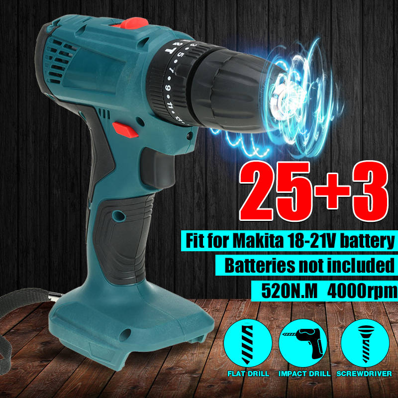 520N.m. Brushless Cordless 3/8`` Impact Drill Driver 25+3 Levels For Makita 18V BatteryFeature: 520N.M high torque, infinitely variable speed switch. Powerful electric drill, multi-function, super power. High-efficiency brushless motor, the maximum output power is 520N.m. Torque and 4000rpm speed. 25 + 3 level settings, provide 25 kinds of torque settings, can achieve high precision work. When the brushless motor is working, no spark is generated, and the motor is not worn. Built-in LED work light can provide lighting in dark places during work. 3 in 1 forward/backward/lock switch, support forward/backward drive and safety lock. 3 stage setting. Three drill bits (flat drill, turning screw and impact drill.) modes can achieve high precision machining. Specification: Name: Brushless Drill Type optional: with impact drill (3 in 1) Adapt to 18-21V Makita battery (not including battery) color: blue No-load speed: 0-4000 rpm Maximum torque: 520N.M Chuck: 10mm Size: 20x15.7cm / 7.9x6.2inch Package Included: 1 x Electric drill (This product does not include batteries)More Details: