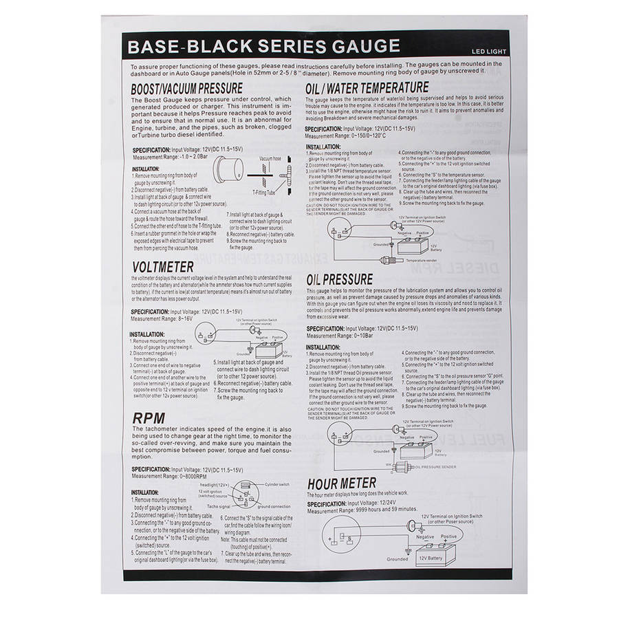 Specification: Dimensions: diameter:52mm. Interior Diesel Gauge. No vibration when driving. Bright White LED illumination for night driving. work on 12V. Aftermarket product / tuning Performance upgrade. Universal type for 12V voltage.