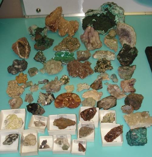 List of individual minerals : Large Malachite geode , Fluorite, Madagascar fossil Nautilus,Rutilated quarts Quarts with tourmaline,Quarts crystal cluster small and medium,Aquamarines single and on matrix,Apophylite ,Amethyst head, fossil,Fluorite , matrimite from Tsumeb cactus quartsz etc Totaling 58 individual pieces