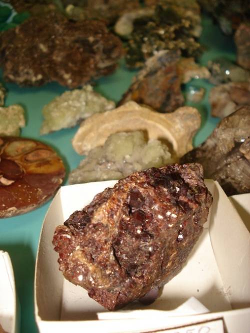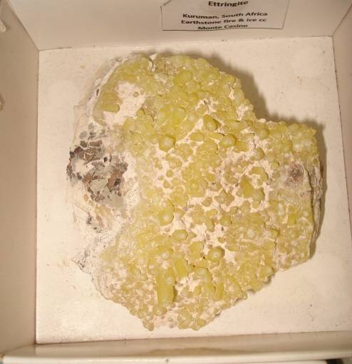Ettringite Kuruman, Brauniite Kuruman , Calcite Nchwaning , Ajoite Mussina , Siderite Aggenuys , 3 x Andradite garnets - Kuruman , Fluorite head Riemvasmaak , Quarts with Lepidichrosite , Calcite with Orlagmanite , Mimetite Tsumeb.