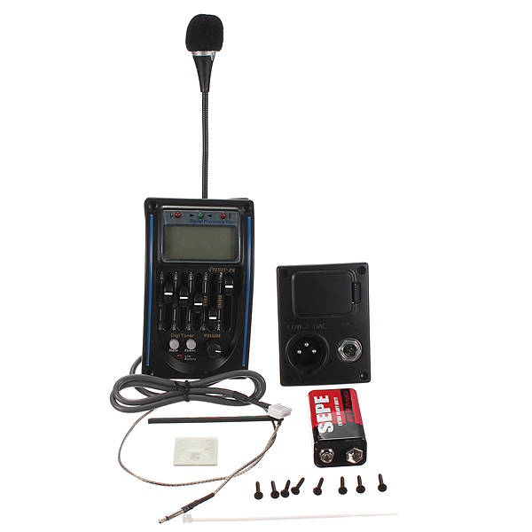 1 x 5 Band EQ Equalizer 1 x Piezo Pickup Line 8 x Mounting screws 1 x Microphone 1 x Battery box 1 x 9V battery