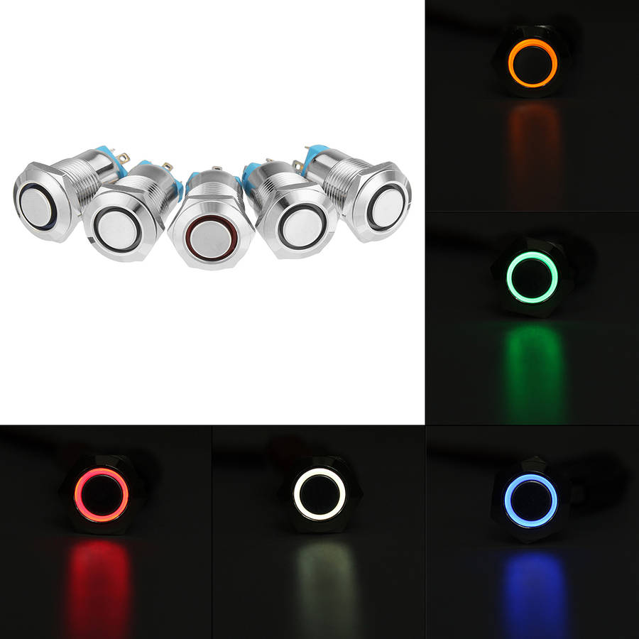 Description5pcs Silver 12mm LED Metal Push Button Latching Switch 4Pin Waterproof Push Button SwitchSpecification: Material: brass nickel plated Switch main Color: Silver LED color: White / Red / Green / Blue / Yellow (each 1pc) Switch Rating: 2A 36V LED Voltage: 12V (When the voltage is higher than 12 V, you need to add external resistor.) Operation Type: Self-locking type, push it-- on, push it again--off. IP Rating: IP65, IK08 Head Shape: High Flush Hole size: 12mm Length: approx. 28.4mm Width: approx. 14mm Quantity: 5pcsFeatures: - Made of brass nickel plated material, strong and durable. - High-grade appearance and nice touch feeling. - Adopt rubber ring and hexagonal nut fixed, anti dust and waterproof, which make it great for outdoors use. - Copper plating silver terminals for good conductive properties. - Self-locking type, push it-- on, push it again--off. - Metal button head durable for longstanding press. Package Included:5pcs x LED Button SwitchNotice: 1. Please allow a bit error due to manual measurement. Please check as much as possible to make sure the item is the one that you need. 2. The color may have different as the difference display, pls understand. 3.There Are No Instructions Included In This Kit. Professional Installation Is Highly Recommended! More Details: