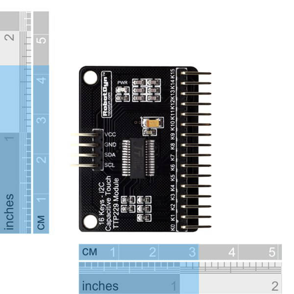 TP229 Capacitive Touch Module have 16 capacitive inputs. The module has two working modes. Module use only 16 key mode. For connection to microcontrollers (, Raspberry, STM) use the I2C interface. To capacitive inputs can connect special capacitive KeyPad, any metal objects, prints of electronic ink or pens, fruits. In our catalog have 16 key touch KeyPad or disk KeyPad.