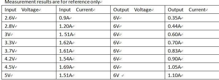 Output 6V : Input voltage DC 2.6 ~ 5.5V,output DC 6V±3% Maximum output : 6V/1100MA(See the table below for details) Pin Description: Vi : Input positive(+). En : Output enable, Connect to GND turn on output, Not connected(Or Connect to Vi) turn off output ,This pin can also be controlled by MCU, low level turn on output, high level Turn off output. G : Input and Output negative(GND/-). Vo: Output positive(+). Applications: Battery powered equipment Instrumentation, multimeter Small power motors PTZ Camera webcam IP Camera Toy car boat Model aircraft Power bank LED Lighting WIFI Router PLC RS485 devices Attention: 1. Input voltage can not be greater than the maximum input. 2. Output power can not be greater than the maximum load for a long time. 3. Input power must be greater than the output power, because the power consumption of the module itself. Package Included: 5 x 6V Step Up Boost Converter Voltage Regulate
