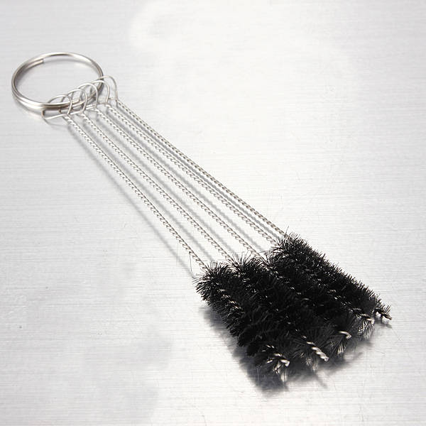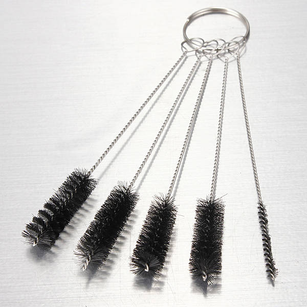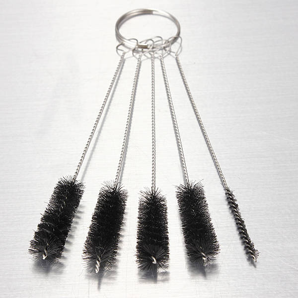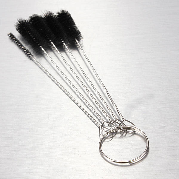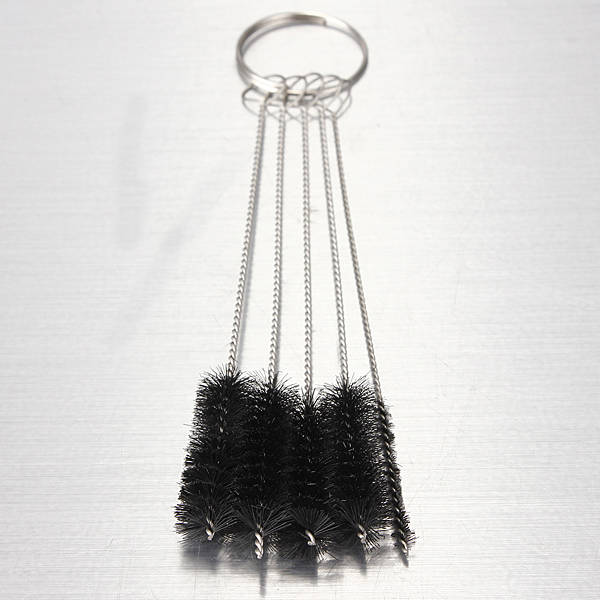 This is a 5 pieces brush set used for cleaning tobacco pipes. Made of stainless steel wiring and tough nylon brushes. Flexible enough to reach around the toughest spots. The bristles are strong enough to scrub out the most stubborn burned in stains. 5 pieces set with different size brush heads from large to small looped on a ring. Stainless steel wire and nylon brushes Comes in convenient plastic holding pouch with flip top sealer