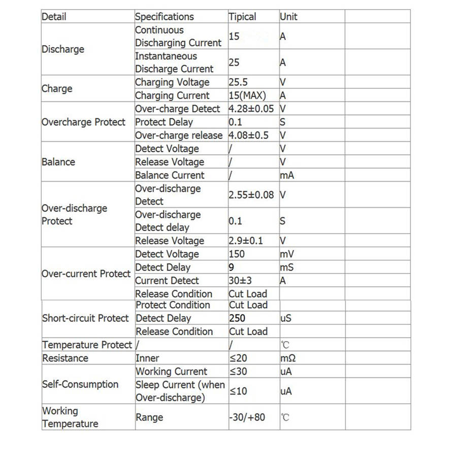 Model: 6 string 22V 24V lithium battery protection board Size: about 4.9x3.1cm (1.92x1.22'') Maximum operating current: Within15A Charging current: Within 15A Balanced charge: None Short circuit protection: Yes Applicable assembly: Nominal 3.7V Batteries / 6 strings