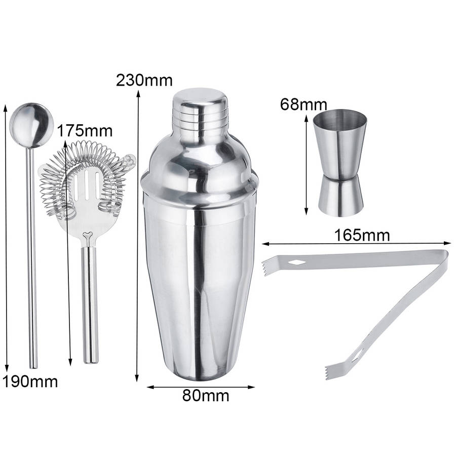 Features: aMix your own delicious cocktail with this professional cocktail maker set. aThe best cocktail maker set for a bartender or anyone who enjoys home bars. aHigh-quality stainless steel, does not leak, durable to use and easy to clean. aThis cocktail shaker set is Iideal for making cocktails at home and, of course, to the cocktail party. Specification: Color: Silver Material: Stainless Steel Cocktail Shaker Height: 23 cm Strainer Length: 17.5 cm Pipette Scoop Length: 19 cm Quantity: 5 Pieces Package Included: 1 x Cocktail Shaker 1 x Measuring Cup 1 x Pipette Scoop 1 x Ice Clip 1 x Strainer Details Pictures: