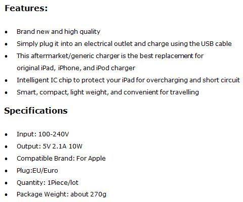 5V 2.1A 10W USB AC Wall Charger for Apple iPad 1 2 3 iPhone 4 plus 30 Pin Sync & Charge Cable