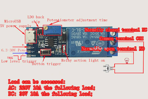Wide voltage 5V-30V Time can be adjusted via a potentiometer, meeting your most occasions Micro USB 5.0V power supply with input, easy to use 5--30V wide supply voltage External triggering and onboard buttons Two triggering methods With a relay pull-in indicator Interference ability, under various interference will not malfunction relay for industrial control.