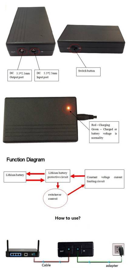 Mini UPS uninterruptible power supply is a standby energy storage power supply. Used safe and environmental lithium cells, credible and stable PCB, trickle/constant-current/constant-voltage lithium battery charging BMS, Created by high performance and efficiency DC-DC, boosting and switching circuit. This mini UPS with perfect over-charged, over-discharged, over-current and short-circuit protection.Application: