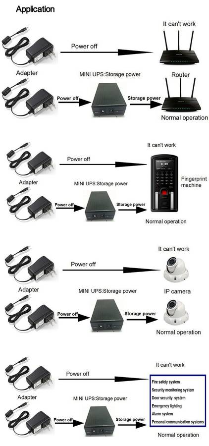 Smart 5V mini ups widely use for Router, Fingerprint attendance machine, Fire safety system, Security monitoring system, Wireless camera, CCTV camera ,personal treatment system, Door security system, Personal data assistant,Eemergency lighting, Alarm system, Personal communication systems, Radio, Digital cameras, Camcorders, Video camera, Bluetooth devices, CD players, MD players, Portable DVD, MP3 players, smart cards etc.